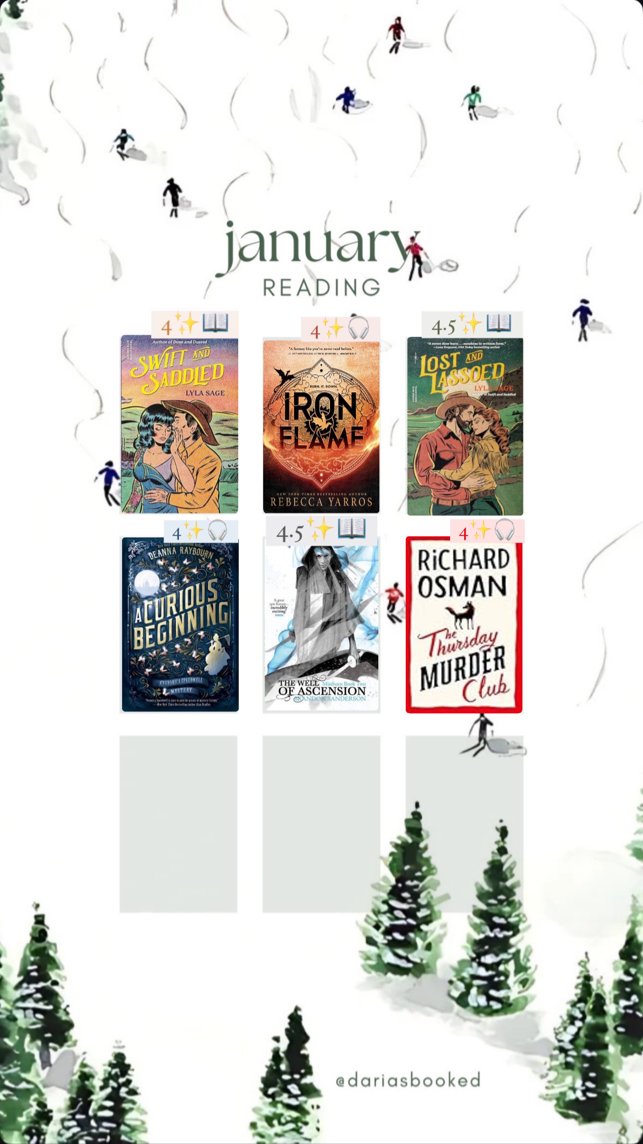 And of course, I had to do a quick reread for Iron Flame before the infamous Onyx Storm came out on January 21st. Spoiler alert. I have since finished Onyx Storm and I really don’t know how I feel about it. My reread of Iron Flame did shock me a bit, I ended up liking it more the second time through. Fourth Wing still remains on top for me and I am curious how Rebecca Yarros will bring this series to an end.